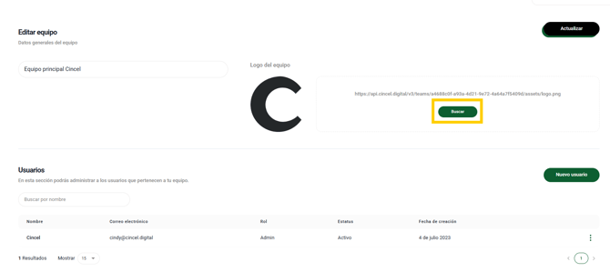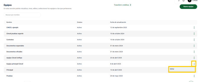 Para editar el logo de una organización debes acceder a “Equipos” en el menú lateral izquierdo. Dentro de este panel, debes dar clic en el botón “Editar” correspondiente al equipo cuyo logo desees cambiar.