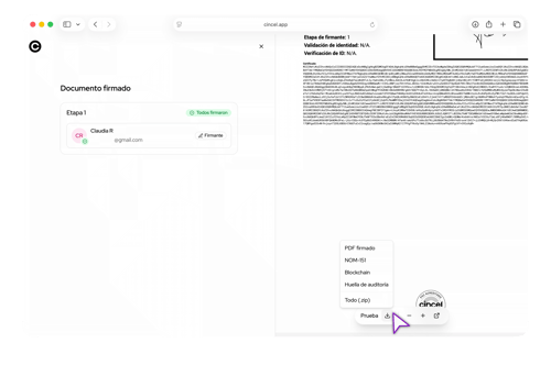 ¡Excelente! Tu documento ha sido firmado por todas las partes y tiene plena validez jurÃdica. Cincel te da acceso al PDF final y a un conjunto completo de evidencias que respaldan su integridad y autenticidad.