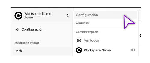 Haz clic en el Nombre del Workspace , en la parte superior del menú lateral izquierdo. Y después en el botón Configuración.