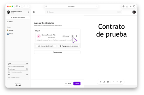 La Prueba de Vida la activa el creador del documento durante el proceso de configuración de los firmantes. Es una funcionalidad disponible incluida en los planes Business, Business Pro o Enterprise de Cincel.