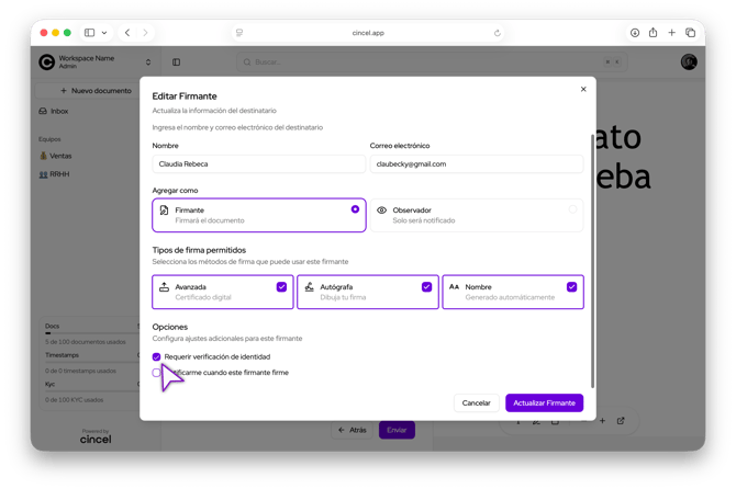 Marca la casilla "Requerir verificación de identidad" y da clic en Actualizar Firmante o Agregar Firmante.