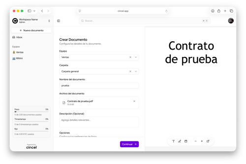 Da clic en el botón "Crear documento", sube tu documento, coloca los datos solicitados y da clic en continuar.